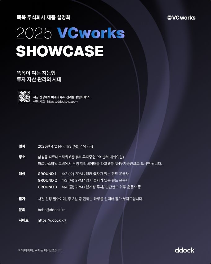 벤처캐피탈(VC)과 출자자(LP), 스타트업을 대상으로 하는 인공지능(AI) 기반 서비스형소프트웨어(SaaS) 솔루션 기업 '똑똑'은 오는 4월 2일부터 4일까지 삼성동 파르나스타워에서 자사 제품 발표회를 진행한다고 밝혔다.
