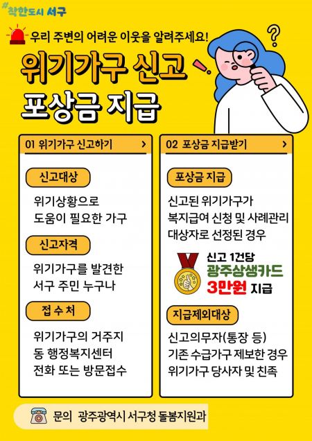 광주시 서구(구청장 김이강)가 복지 사각지대에 놓인 위기가구를 발견해 제보한 주민에게 포상금을 기존 2만원에서 3만원으로 상향 조정해 지급한다.