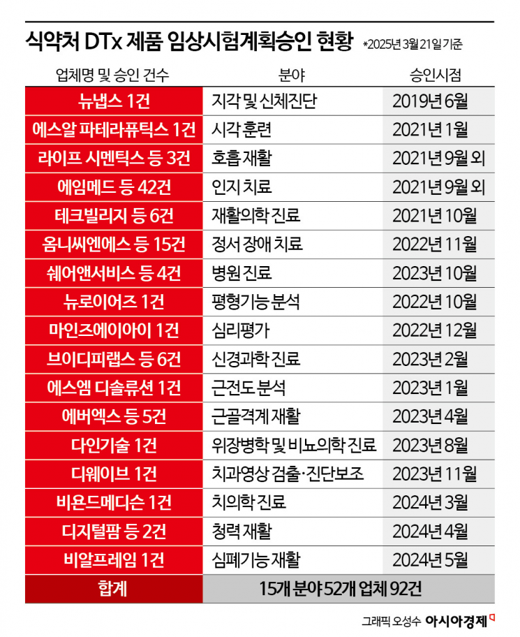 식품의약품안전처에 따르면 뉴냅스의 뇌손상 후 시야장애 개선을 위한 치료기기, 에스알 파테라퓨틱스의 소아 근시환자용 치료기기, 에프앤아이코리아의 니코틴 중독 치료기기, 마인즈에이아이의 정서장애 치료소프트웨어 등 52개 업체의 92개 시제품이 임상을 진행 중이다. 여기서 절반 정도만 최종 허가를 받아도 국내 시장에 출시될 디지털 치료제 수는 50개를 넘게 된다.