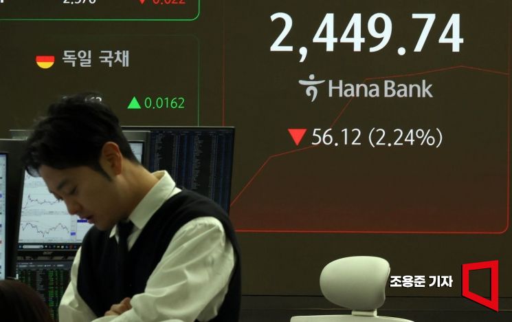 도널드 트럼프 미 행정부가 한국에 25%의 상호관세 세율을 적용한 3일 서울 중구 하나은행 본점 딜링룸에서 딜러가 업무를 보고 있다. 이날 코스피는 전날보다 68.43p(2.73%) 내린 2,437.43으로, 원/달러 환율은 4.4원 오른 1,471.0원, 코스닥은 14.10p(2.06%) 내린 670.75로 시작했다. 2025.4.3 조용준 기자