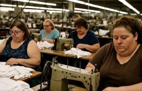 도널드 트럼프 미국 대통령의 관세 정책을 조롱하기 위해 인공지능으로 생성한 영상의 한 장면. 미국 여성 노동자들이 공장에서 작업하고 있다. 틱톡 계정 axiang67 캡처
