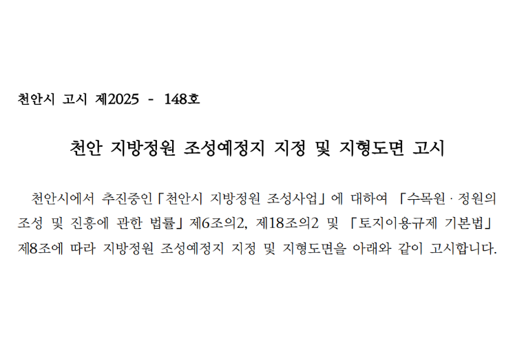 14일 공고에 따르면 시는 성환읍 대홍리 일원의 23ha 규모 부지를 지방정원 조성 예정지로 지정했다.