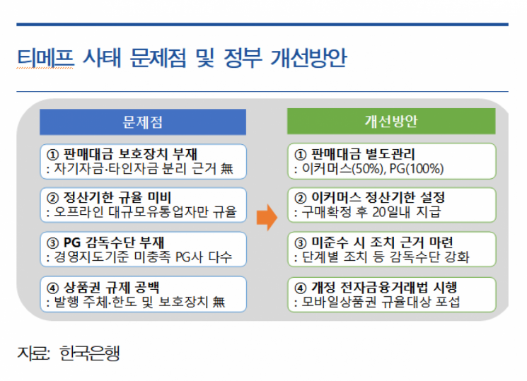 한은은 관련 제도적 문제점으로 판매대금 보호장치 부재, 정산기한 규율 미비, PG 감독 수단 부재, 상품권 규제 공백을 꼽았다. 대규모유통업법, 전자금융거래법 등 관련 법령에 판매대금에 대한 보호장치가 존재하지 않는다는 점을 첫 번째 문제로 들었다. 이에 정부는 이커머스(대규모유통업법) 및 PG사(전자금융거래법)에 판매대금(미정산대금)의 예치·신탁·지급보증보험 가입 등 별도 관리 의무를 부여하고 별도 관리 대금 등은 양도·담보 제공 및 제3자의 압류·상계를 금지하는 방향으로 관련 법령을 개정할 계획이다.