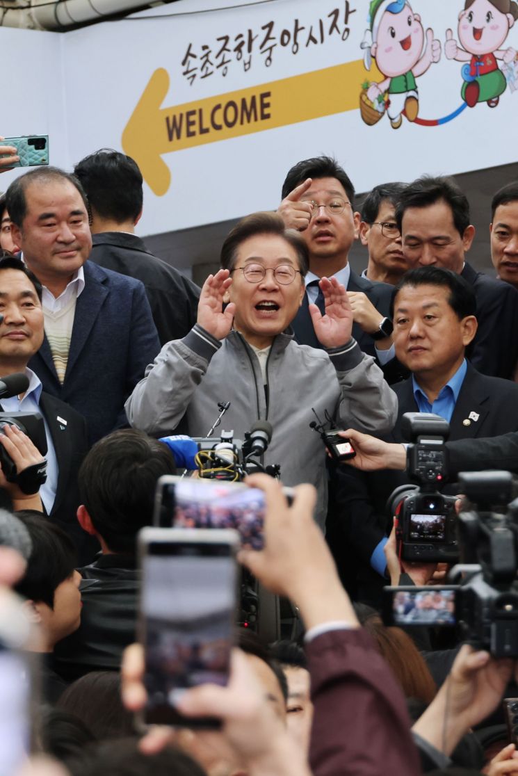 이날 오전 11시부터 진행된 속초중앙시장에서 이 후보는 경호가 강화됐다는 것을 언급하며 "이날 또 무슨 일이 있을 것이라고 해서 제가 조심해야 하는데 이해해 주시겠느냐"고 시민들을 향해 물었다. 그러면서 "손은 못 잡아도, 눈은 맞출 수 있다"고 강조했다.