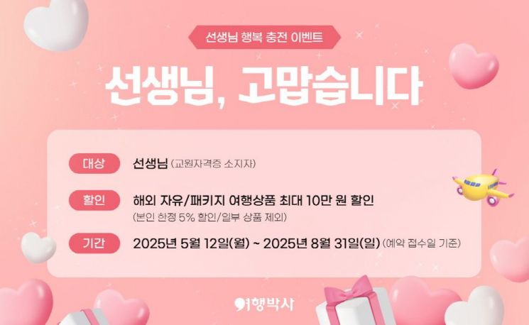 - 스승의 날 기념, 5월 12일부터 8월 31일까지 진행… 교사 대상 해외여행 5% 할인 혜택