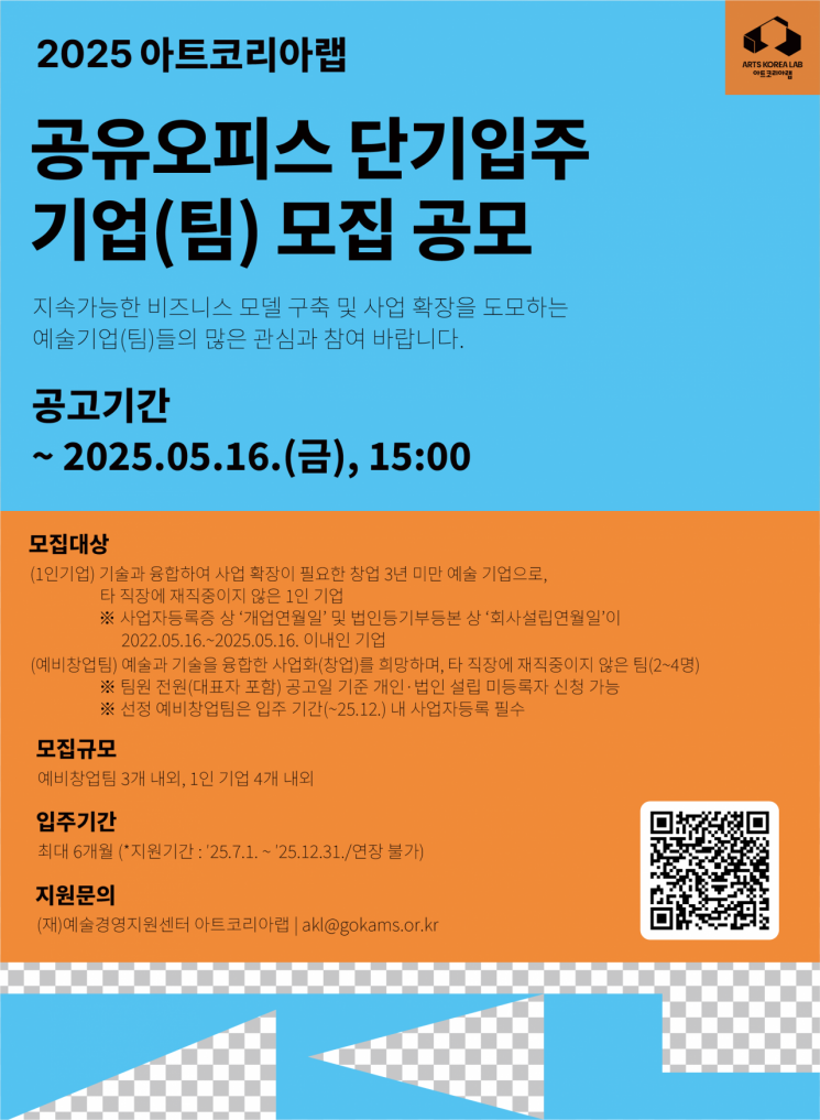 아트코리아랩은 문화체육관광부와 예술경영지원센터가 2023년 10월 개관한 예술가·예술기업 종합지원 플랫폼이다. 예술기업이 안정적으로 창업하고 성장할 수 있도록 사무공간, 창제작·시연 공간 등 인프라 제공 및 이와 연계된 다양한 지원 사업을 운영하고 있다. 그 일환인 단기입주 지원 프로그램은 기술과 융합 확장이 필요한 예술기업(팀)을 위해 마련됐으며, 6개월간 입주공간, 제작시설, 맞춤형 성장 지원 프로그램을 제공한다.