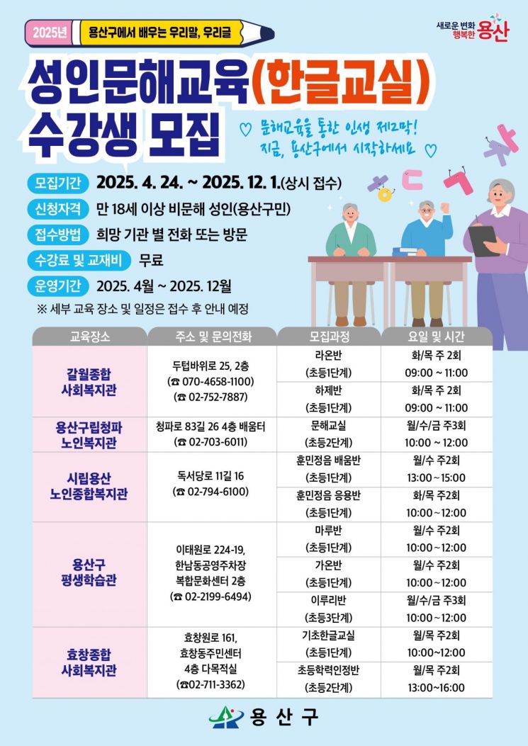 교육은 갈월종합사회복지관, 용산구립청파노인복지관, 시립용산노인종합복지관, 용산구평생학습관, 효창종합사회복지관에서 초등 1~3단계 등 다양한 수준으로 운영된다. 신청은 용산구 거주 만 18세 이상 비문해 성인을 대상으로 연중 상시 접수하며, 수강료와 교재비는 무료다.