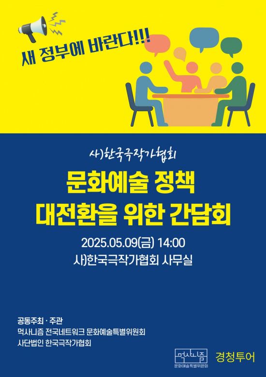 한국극작가협회는 이재명 후보 원외 조직인 '먹사니즘 네트워크'와 공동으로 9일 오후 2시 한국극작가협회 사무실에서 '새 정부에 바란다. 문화예술정책 대전환을 위한 간담회'를 개최한다고 밝혔다.