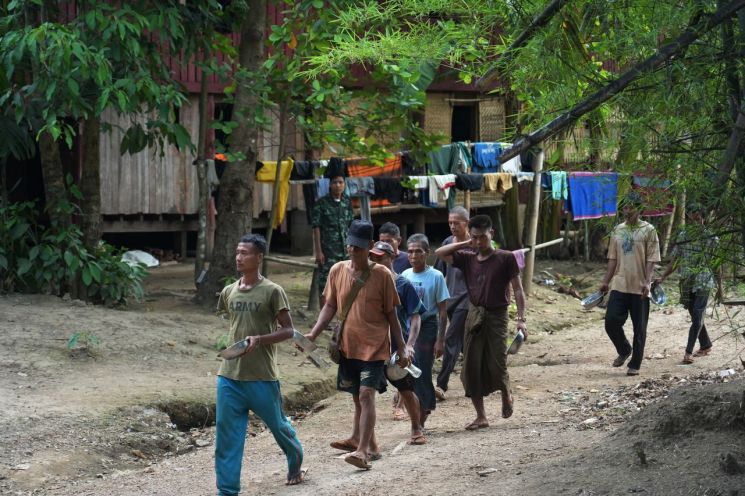 지난달 21일(현지시간) 미얀마 정글 한 임시 포로 수용소에서 인민방위군(PDF) 감시 속에서 전쟁 포로들이 이동하고 있다. 이 수용소는 미얀마 국민통합정부(NUG)의 무장 조직인 PDF가 운영 중이다. EPA연합뉴스