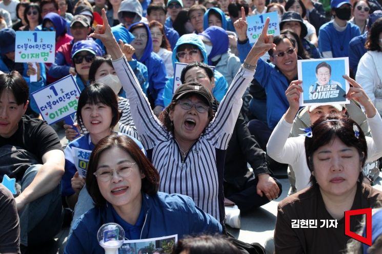 제21대 대통령선거 공식 선거운동 첫 날인 12일 서울 청계광장에서 열린 더불어민주당 중앙선거대책위원회 출정식에서 지지자들이 이재명 후보를 연호하고 있다.