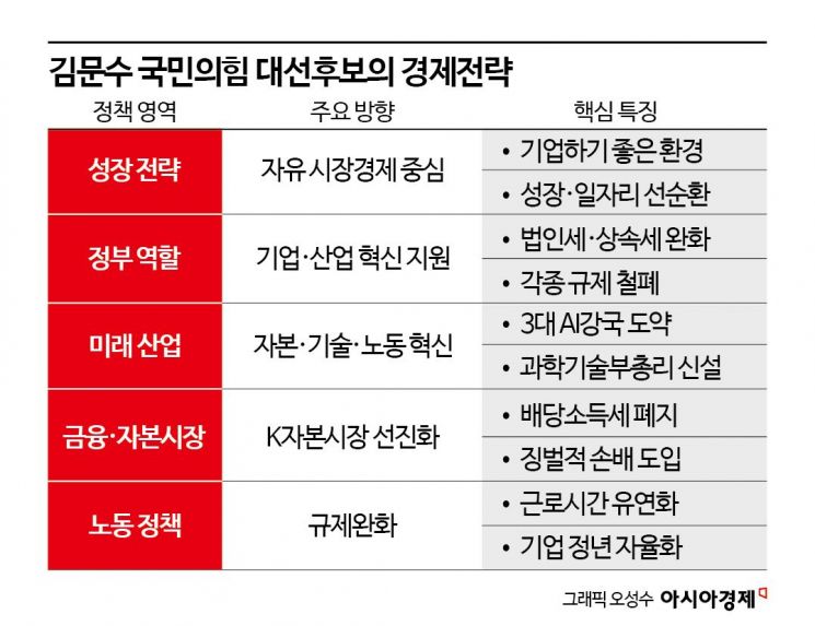 정부 개입은 최소화하고 민간의 자율성이 최대한 보장돼야 경제적 효율성이 극대화될 수 있다는 게 김 후보 생각이다. 문재인 정부의 '소득 주도 성장'과 상반되고, 윤석열 정부의 '민간 주도 성장'과 비슷하다. 법인세·상속세 최고세율 인하, 주 52시간 근무 규제 개선, 원자력 발전 확대와 산업용 전기료 인하 등 기업 활동 지원 공약이 많은 것도 이 때문이다.
