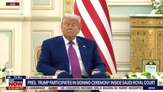 13일(현지시간) 더 데일리 비스트에 따르면 이날 사우디아라비아 수도 리야드의 왕궁에서 열린 서명식에 참석한 트럼프 대통령이 의자에 앉아 꾸벅 조는 모습이 폭스뉴스 등을 통해 생중계됐다.
