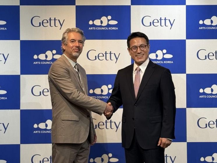 22일 오전 종로 예술가의집에서 열린 기자간담회에서 한국문화예술위원회 전병국 위원장(오른쪽)과 게티연구소 부소장 앤드류 페르척이 악수하고 있다. 한국문화예술위원회