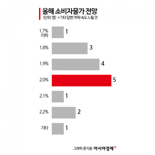 올해 물가상승률은 2.0%를 전망한 전문가가 5명으로 가장 많았다. 1.9%가 4명으로 뒤를 이었다. 대부분의 전문가가 한은 전망치(1.9%)와 부합할 것으로 봤다. 다만 응답자 중 4명은 1.7~1.8%를 전망해 한은 전망을 하회할 것으로 봤다. 관세 정책으로 인한 상승 압력에도 부진한 소비가 물가상승률을 끌어내릴 것으로 전망했다. 반대로 2.2%까지 오를 것이라는 전망도 2명이 내놨다. 안예하 키움증권 연구원은 "관세 정책으로 인한 물가 상승 압력을 고려하면 소폭 상향 조정될 수 있다"고 말했다.
