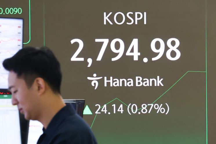이날 오전 9시 30분 기준 코스피는 전일 대비 25.36포인트(0.92%) 오른 2796.20에 거래되고 있다. 앞서 지수는 19.49포인트(0.70%) 상승한 2790.33에 출발했다. 개인과 기관이 각각 1185억원, 1016억원을 순매도할 동안 외국인 홀로 2432억원어치를 사들였다.