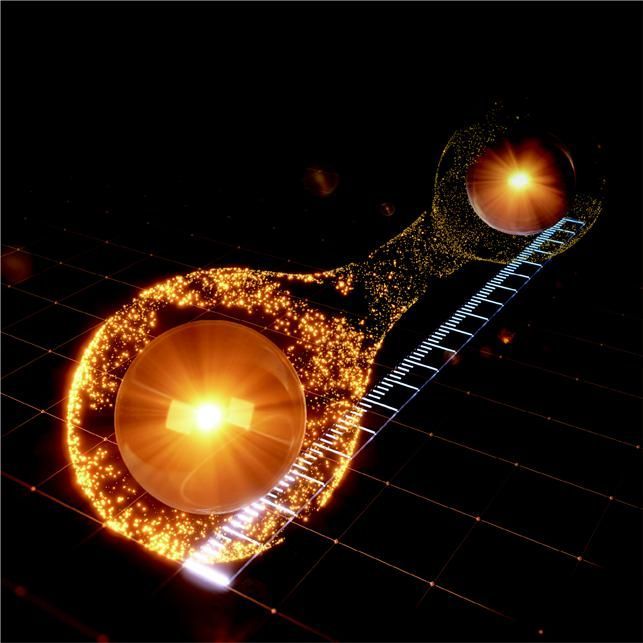 양자거리 측정 개념도. 두 개의 노란 공은 전자를 나타내며, 그 아래 흰색 눈금은 거리를 측정한다는 의미로 ‘자’를 표현한 것이다. 전자 간의 유사성을 의미하는 양자 거리는 실제 거리와 약간 다른 개념이지만 ‘양자거리 측정’을 직관적으로 표현하기 위한 그림이다. 이미지=김근수 연세대 교수 제공