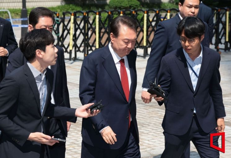윤석열 전 대통령이 26일 서울 서초구 서울중앙지방법원에서 열린 내란 우두머리 혐의ㆍ직권남용 권리행사 방해 혐의 사건 5차 공판에 출석하고 있다. 사진공동취재단