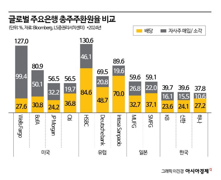 9일 LS증권과 블룸버그 등에 따르면 작년 기준 KB국민은행과 신한은행, 하나은행 등 국내 주요 은행의 총주주환원율은 37~39% 정도다. 총주주환원율은 순이익에서 배당과 자사주 매입·소각 등 주주환원액이 차지하는 비중을 의미한다.