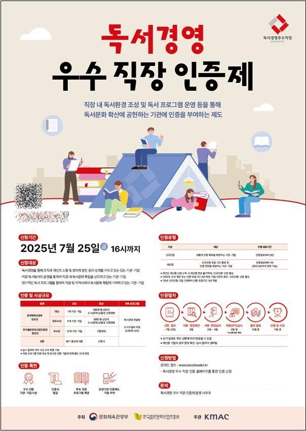 문화체육관광부는 한국출판문화산업진흥원과 다음 달 25일까지 전국 기업과 기관을 대상으로 '2025년 독서경영 우수직장 인증' 신청을 받는다고 16일 밝혔다.