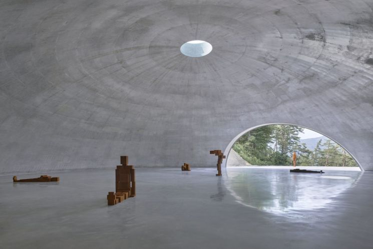 강원도 원주에 소재한 뮤지엄 SAN에 마련된 세계적인 건축가 안도 타다오와 조각의 거장 안토니 곰리의 첫 협업 미술 공간 'GROUND'가 19일 첫선을 보였다. 내부 직경 25m, 천고 7.2m, 직경 2.4m의 원형 천창을 갖춘 돔 형태의 공간으로, 뮤지엄 SAN의 플라워 가든에 조성됐다.