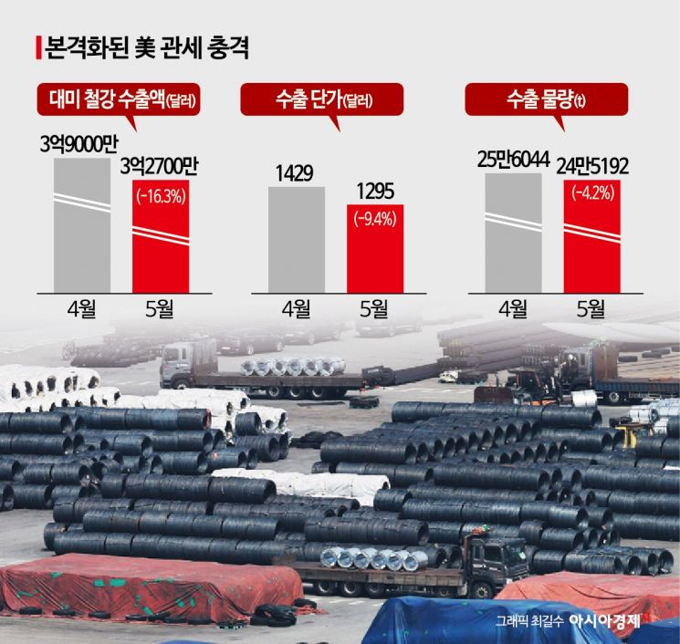 수출 하락은 한국철강협회가 지난 6일 공개한 자료에서도 확인된다. 철강협회에 따르면 지난달 대미 철강 수출 물량은 24만5192t으로, 전년 동월(25만6044t) 대비 4.2% 감소한 것으로 집계됐다. 3~5월 누적 수출량도 72만1650t으로, 전년 같은 기간(74만1061t)보다 2.6% 줄었다.