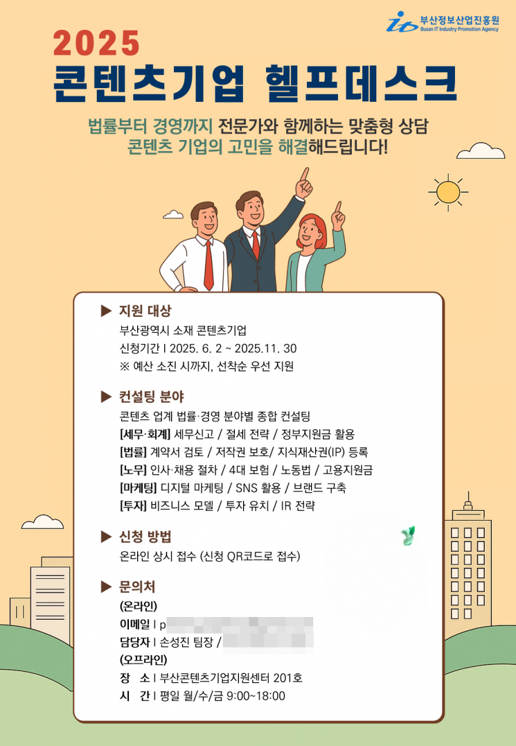 진흥원은 부산콘텐츠비즈타운 내 상주 상담 매니저를 통해 매주 월·수·금 오전 9시부터 오후 6시까지 상담을 진행하고 있으며, 사전 예약 후 1:1 전문가 매칭 방식으로 이뤄진다.