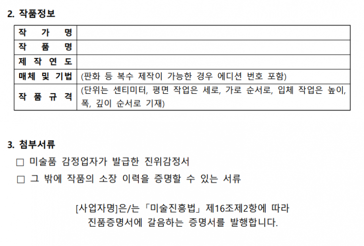 문체부 고시 양식에 따라 시가·진품 감정해야