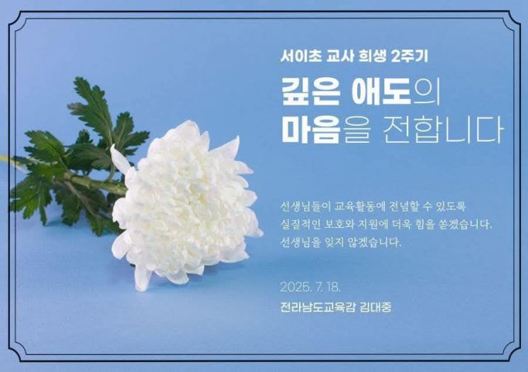 김대중 전남교육감이 서이초등학교 교사의 순직 2주기를 맞아 고인을 기리며 "잊지 않겠다"는 깊은 추모의 뜻을 전했다.
