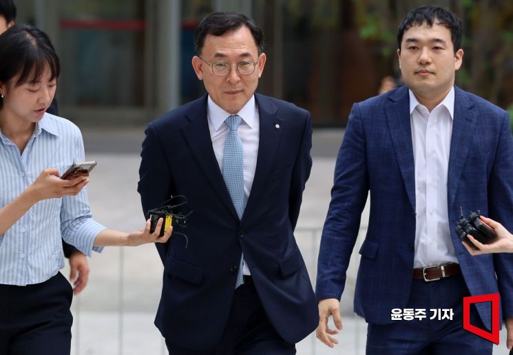 정근수 전 신한은행 부행장이 23일 서울 종로구 KT광화문빌딩 웨스트에 마련된 김건희 특검 사무실로 출석하고 있다.
