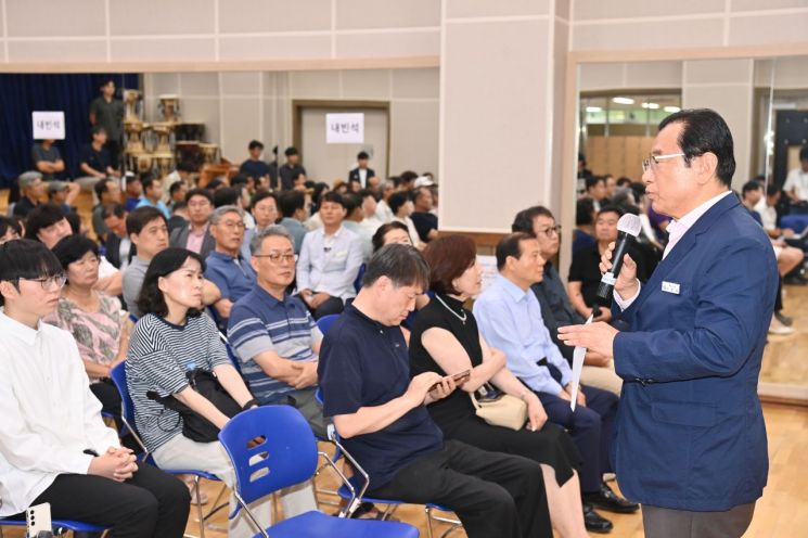 이현재 하남시장이 지난 7일 미사2동 행정복지센터 3층에서 LH가 주관하는 '한강교량(가칭 선동대교/수석대교)' 실시설계(안) 주민설명회를 개최하고 있다. 하남시 제공