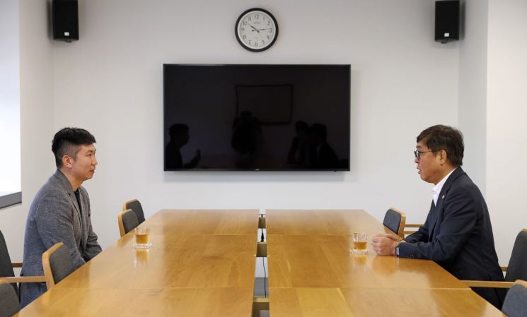 최휘영 문화체육관광부 장관이 8일 서울 종로구 국립현대미술관 서울관에서 유승민 대한체육회장을 만나 체육계 현안 등에 대해 논의하고 있다. [사진 제공= 문화체육관광부]