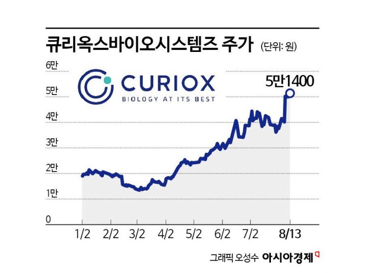 14일 금융투자업계에 따르면 큐리옥스바이오는 올해 들어 177% 올랐다. 12일 장 중 한때 5만3800원을 기록하며 사상 최고가를 경신했다.
