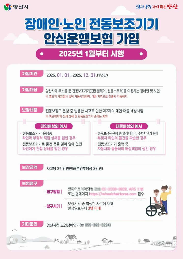 양산시에서 올해 첫 가입한 '장애인·노인 전동보조기기 안심운행보험'은 전동보조기기 운행 중에 발생할 수 있는 제3자에 대한 대인·대물 배상책임을 최대 2000만원 한도로 보장하는 보험 상품이다.