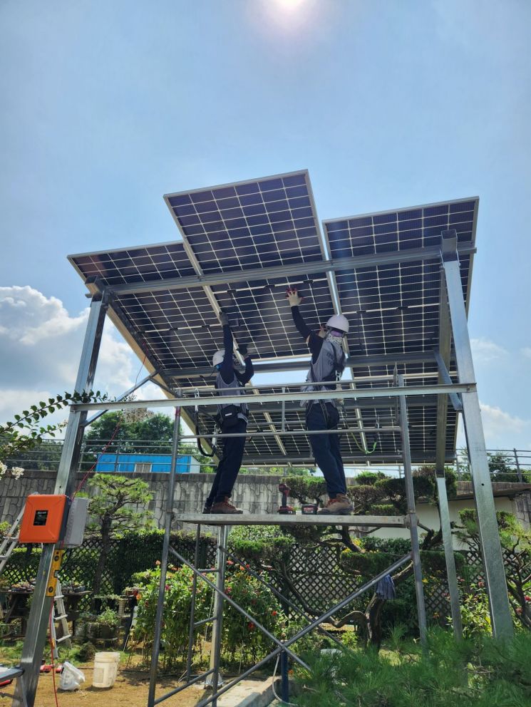 용인시는 내년 총 30억원의 예산을 투입해 203곳의 주택, 건물에 신재생에너지 설비 설치를 지원한다. 업체 관계자들이 용인 포곡읍 금어리에서 태양광 설비를 설치하고 있다. 용인시 제공