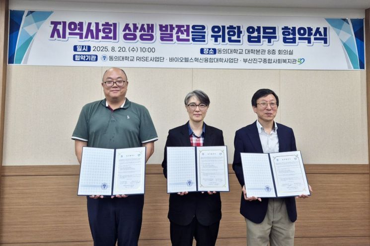 협약식에는 동의대 RISE사업단 공유협력센터 이현섭 소장과 바이오헬스혁신융합대학사업단 정경태 단장, 부산진구종합사회복지관 권혜미 관장 등 관계자들이 참석했다.