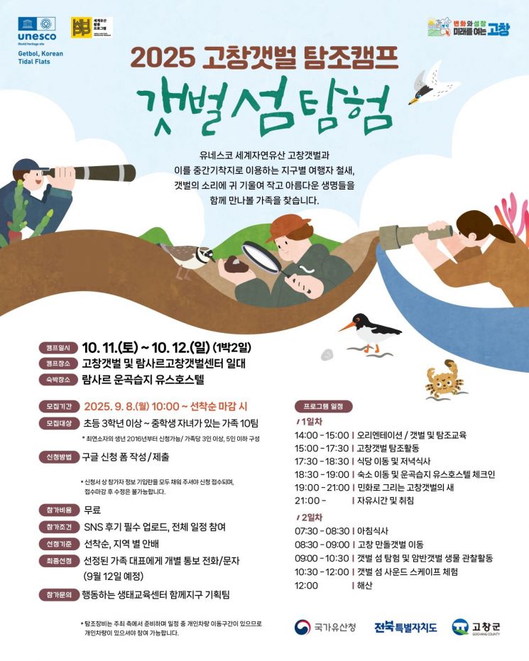 29일 군에 따르면 이번 캠프는 '갯벌 섬 탐험'을 주제로, 세계자연유산 고창갯벌을 중심으로 철새 탐조 활동과 생태교육 프로그램이 함께 진행된다.