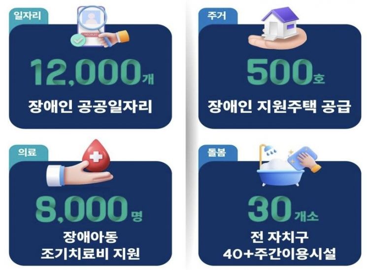 우선 '일자리' 제공과 안정적 '소득 보장'을 위한 지원에 나선다. 장애인 공공일자리를 현재 연간 5000개 수준에서 2027년 7000개, 2030년 1만2000개로 단계적으로 늘린다. 장애인 공공일자리는 공공기관·복지관 행정지원업무 등 '일반사무보조형'을 비롯해 요양보호사 보조·어르신 안마서비스 등 '사회서비스형', 바리스타·사서 등 '취업연계형' 등이 있다.
