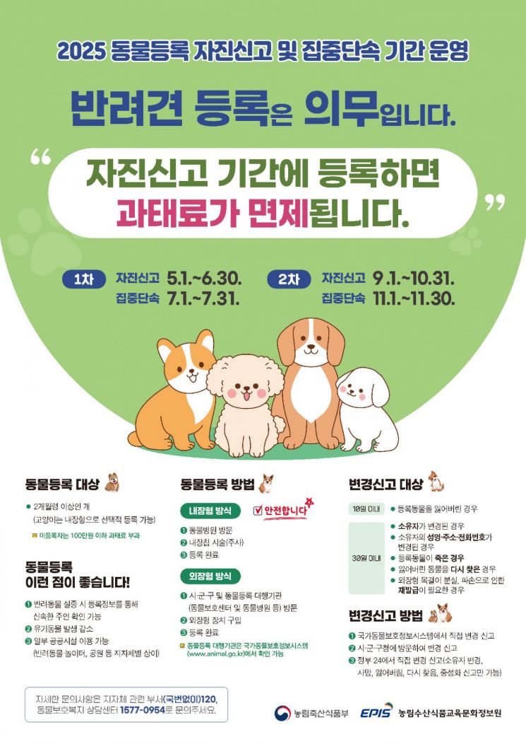 이강기 농업정책과장은 "동물등록은 반려견 보호자가 반드시 준수해야 하는 법적 의무다"며 "등록뿐 아니라 외출 시 목줄 착용(2m 이내)과 배설물 수거 등 펫티켓을 준수해 책임 있는 반려동물 문화 정착에 함께해 주시기를 바란다"고 말했다.