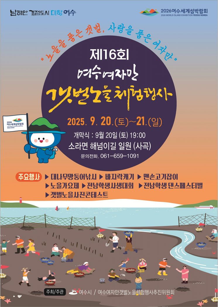 전남 여수시(시장 정기명)는 오는 20~21일 이틀간 소라면 해넘이길 일원에서 '제16회 여수여자만갯벌노을체험행사'를 개최한다고 19일 밝혔다. 이번 행사는 여자만의 황홀한 석양과 갯벌 생태, 문화를 체험하며 가을 바다의 정취를 만끽할 수 있도록 준비됐다.