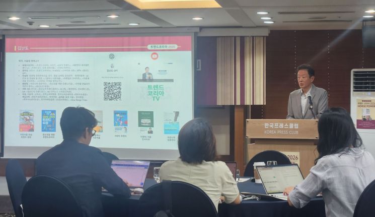 '트렌드 코리아 2026'(미래의창)이 지목한 내년 화두는 인공지능(AI)이다. 2009년 이후 18년째 시리즈를 이어오면서 그간 경제 현상과 밀접한 키워드가 두드러졌지만, 올해는 이례적으로 AI가 주요 키워드로 드러났다. 24일 오전 서울 중구 프레스센터에서 열린 기자간담회에서 대표 저자인 김난도 작가는 "중요성에 따라 의도적으로 AI를 반영한 것이 아니라, 기존 프로세스에 따라 분석해보니 AI의 영향력이 예상외로 매우 컸다"고 말했다.