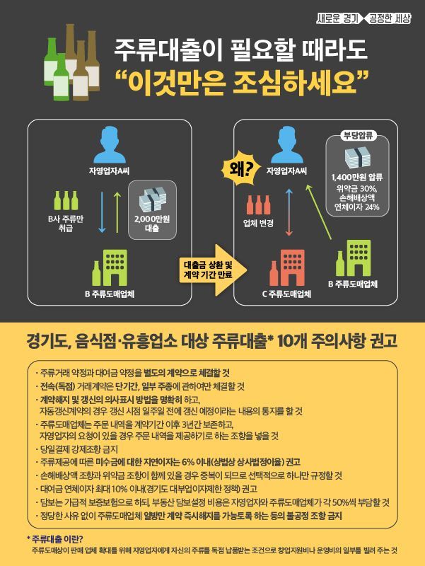 주류대출은 주류 도매상에세 수천만 원을 무이자로 빌려서 쓰는 대신, 해당 도매상과 납품 독점 계약을 맺는다. 예를 들어 도매상에게 3000만원의 주류대출을 받았다면, 점주는 도매상에게 매월 100만원씩 3년간 상환한다는 계약서를 쓴다. 이 기간에 납품 계약을 해지하거나 폐업을 하면 위약금이나 이자를 내야 하는 조항이 붙는다. 실제로 코로나19 팬데믹 당시에는 하루만 상환이 늦어도 지연 이자를 20% 이상 받는 등 점주들에게 불리한 조건의 주류대출이 성행해 문제가 됐다.