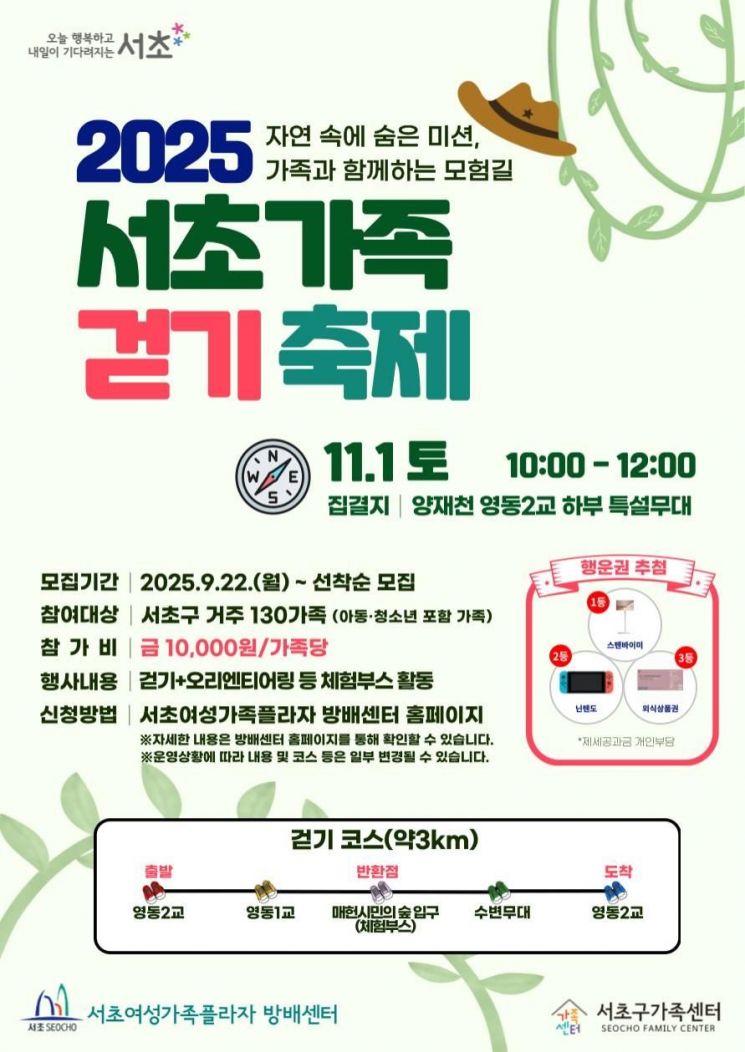 서울 서초구(구청장 전성수)가 서초여성가족플라자 방배센터, 서초구 가족센터와 함께 다음 달 1일 양재천에서 ‘2025 서초가족 걷기 축제’를 개최한다.