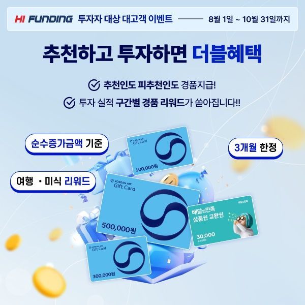 한편, 하이펀딩은 투자자 저변확대를 위한 추천이벤트를 진행하고 있다. 추천인과 피추천인 모두에게 배달의민족 상품권과 대한항공 상품권을 최대 50만원까지 제공하고 있다. 이벤트는 10월 말까지 진행되며 하이펀딩 홈페이지에서 참여가 가능하다.
