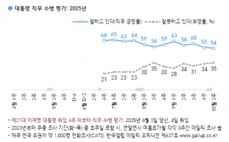 17일 한국갤럽이 공개한 여론조사(14~16일 전국 18세 이상 1001명 대상으로 무선전화 인터뷰 방식으로 조사, 응답률은 12.1%, 표본오차는 95% 신뢰수준에 ±3.1%포인트)에 따르면 추석 연휴를 거치며 이 대통령의 국정 수행과 관련해 잘하고 있다는 긍정 평가는 3주전(9월4주) 조사와 비교해 1%포인트 하락한 54%로 나타났다. 잘못하고 있다는 여론은 1%포인트 오른 35%였다.