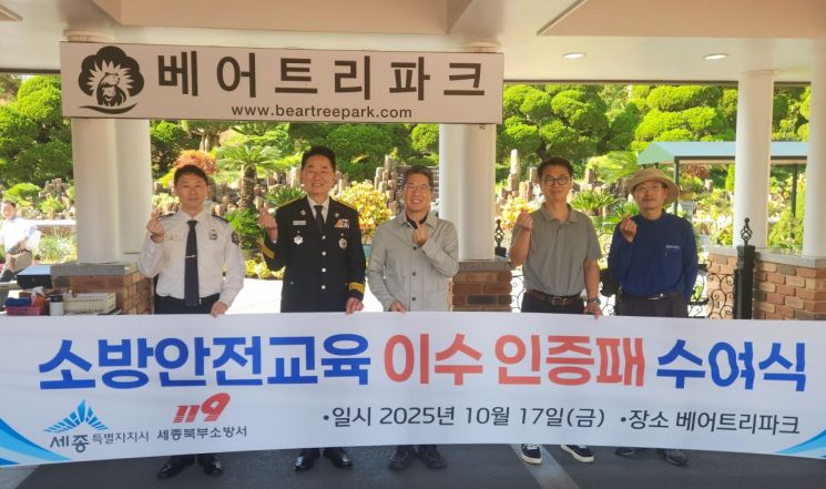17일 세종소방본부 북부소방서에 따르면 전동면에 소재한 베어트리파크에 인증패를 전달했다. 소방안전교육 우수 인증공원은 시민과 밀접한 기관·단체의 소방 안전 역량을 강화하기 위해 추진 중인 '소방안전교육 인증제'의 일환이다.