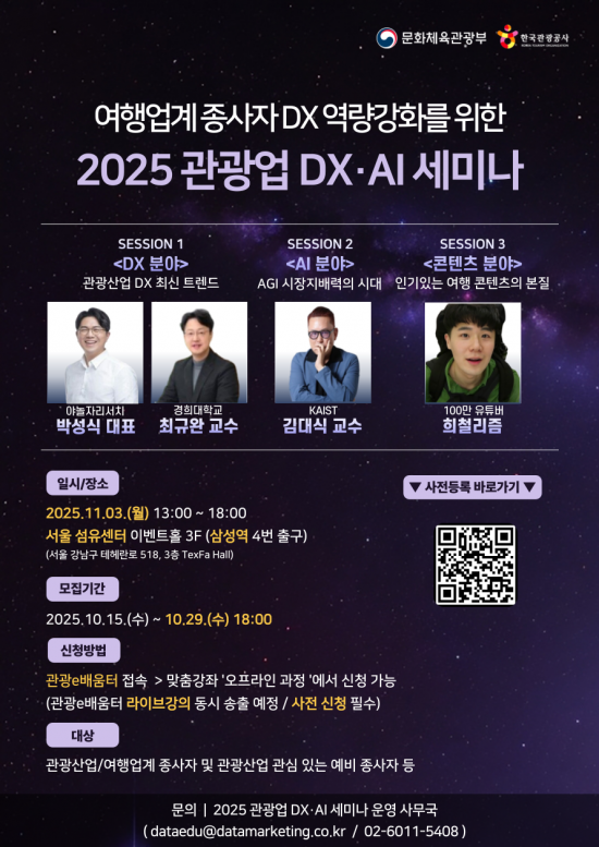 문화체육관광부와 한국관광공사는 관광산업 종사자의 디지털전환(DX), 인공지능(AI)과 연계한 역량 강화를 위해 오는 11월3일 서울 강남구 섬유센터 이벤트홀에서 '관광업 DX·AI 세미나'를 개최한다고 20일 밝혔다.