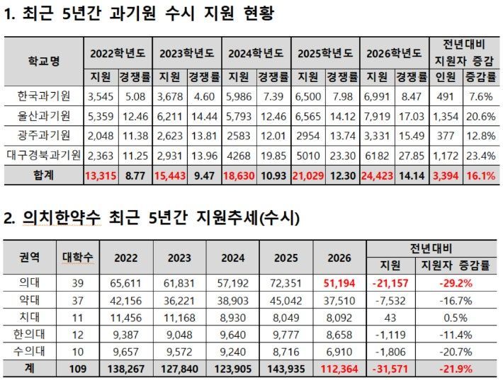 올해 대학 수시모집에서 의대 등 의약학 계열 지원자는 최근 5년 사이 가장 적은 반면, 과학기술원과 인공지능(AI) 관련 학과에는 지원자가 대폭 늘어난 것으로 나타났다. 상위권 수험생들의 지원 흐름이 의학 계열에서 이공계로 옮겨가고 있다는 분석이 나온다.