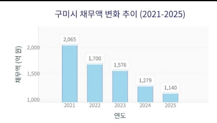실제 구미시의 채무는 ▲2021년 2065억원 ▲2022년 1700억원 ▲2023년 1576억원 ▲2024년 1279억원 ▲2025년 현재 1140억원으로 4년간 925억원이 줄었다.