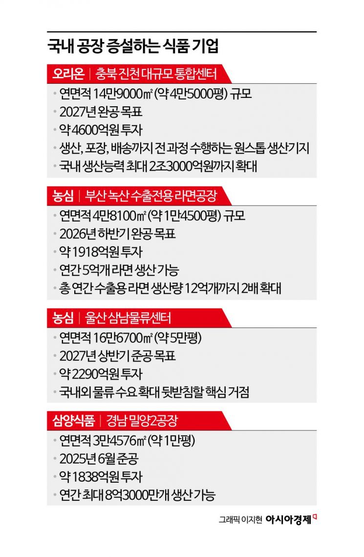오리온뿐만 아니다. 농심 도 국내에 수출 전용 공장과 물류센터를 동시에 짓는 투트랙 전략을 펴고 있다. 부산 녹산국가산업단지에 건립 중인 '녹산 수출전용공장'(2026년 하반기 완공 예정)과 울산 울주군 삼남물류단지 내 '울산삼남물류센터'(2027년 상반기 준공 예정)가 핵심이다. 녹산공장은 완공 후 3개 라인으로 연간 5억개의 라면을 생산해 기존 부산공장(6억개)과 구미공장(1억개)을 포함, 농심의 연간 수출용 라면 생산량을 총 12억개로 두 배 가까이 늘리게 된다. 울산삼남물류센터는 이같은 농심의 글로벌 물류 네트워크를 지원하는 '허브' 역할을 맡는다.