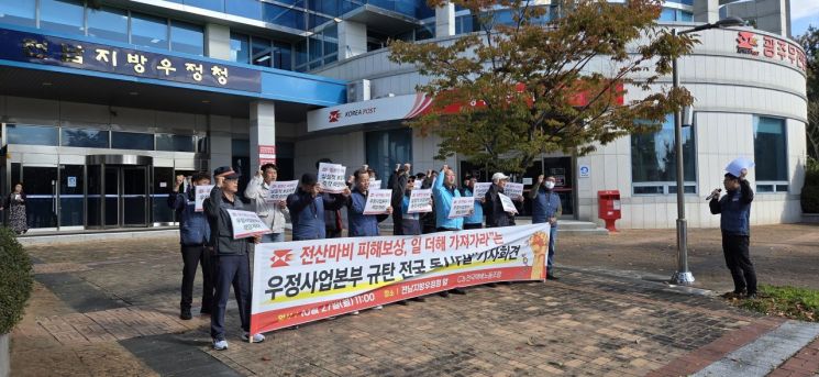 전국택배노동조합 우체국본부 전남본부는 27일 광주 서구 치평동 전남지방우정청 앞에서 '우정사업본부 규탄 전국 동시다발 기자회견'을 열고 "우정사업본부가 국정자원 화재에 따른 국가 재난 피해를 오히려 노동자에게 전가하고 있다"며 "우정사업본부는 택배노동자들에게 정당한 피해 보상안을 제시하라"고 촉구했다.